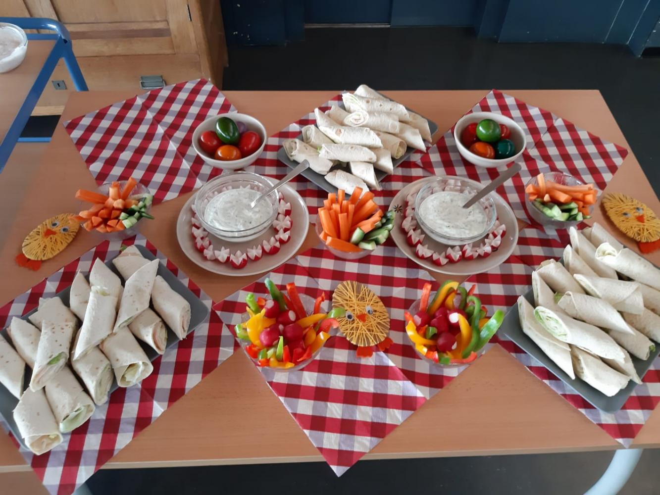 Einmal im Monat gibt es bei uns eine Gesunde Jause für alle, die abwechselnd von jeder Klasse zubereitet wird. Diesesmal legte sich die 2E ins Zeug und zauberte eine frühlingshafte Jause. Schön anzuschauen und wunderbar im Geschmack ließ sie uns die winterlichen Temperaturen vergessen. Vielen Dank an die fleißigen Köche der 2E!