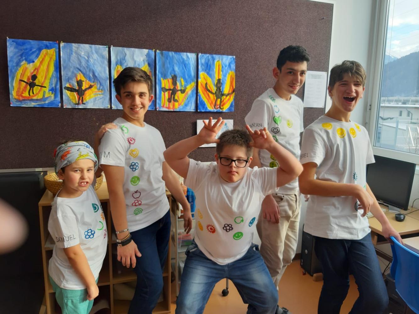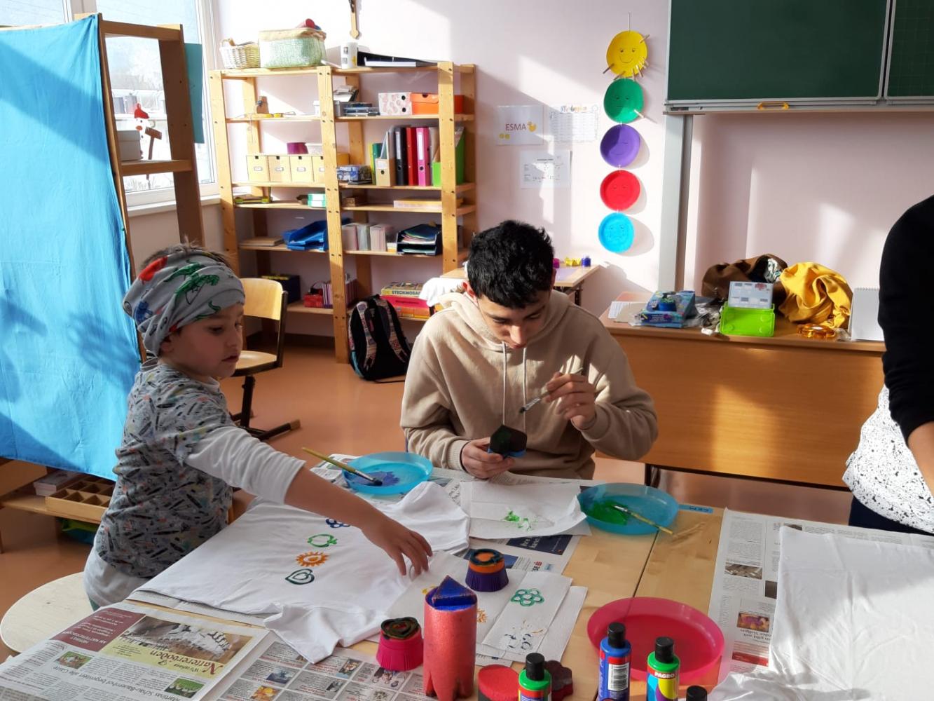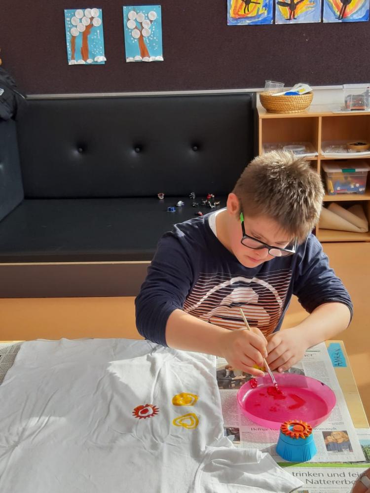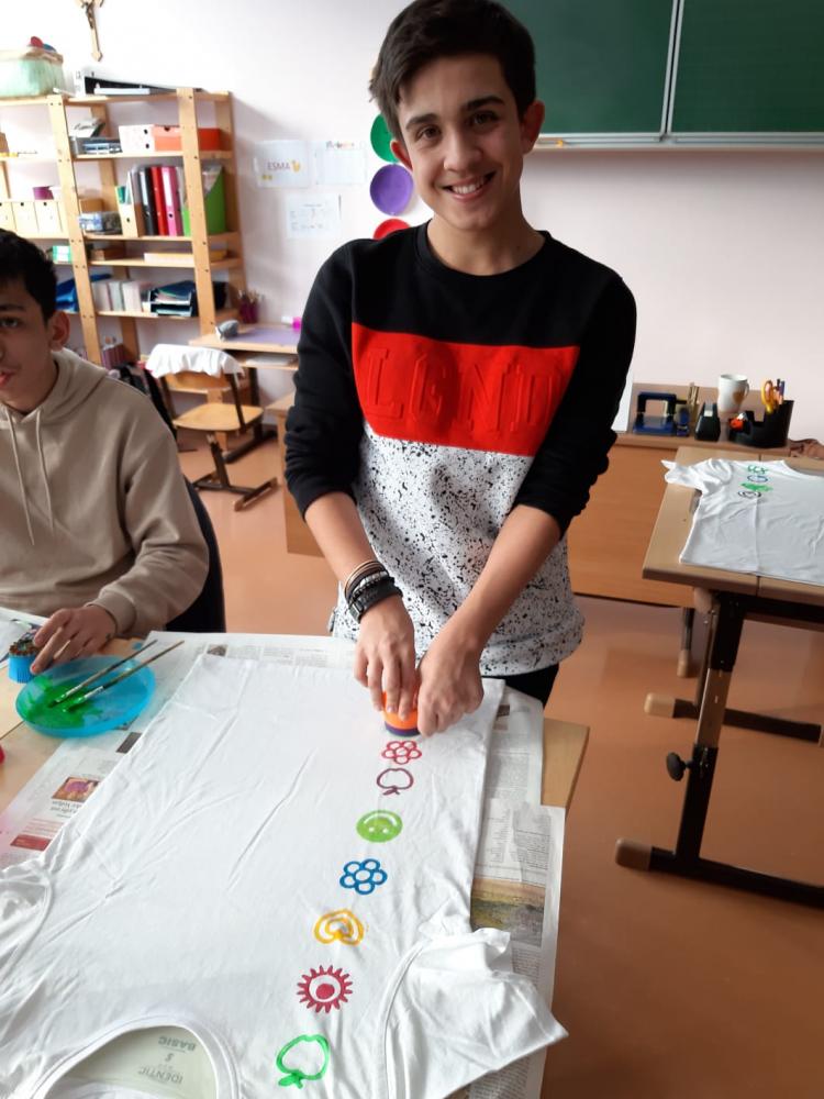 Weiche Stempel, klebrige Farbe, ein paar weiße T-Shirts und los geht's! Die 2E legte sich ins Zeug und stempelte sich ihre Koch-T-Shirts einfach selbst. Schon zu Beginn musste genau überlegt werden, welches Muster nun wohin gehört, denn: Einmal aufgestempelt, gibt es kein Zurück mehr! Damit die Farbe hält, mussten die Kleidungsstücke noch mehrere Minuten lang gebügelt werden. Auch das ließen sich die Schüler nicht nehmen. Nun sind alle stolze Träger ihres 100% Do-it-yourself-Shirts.