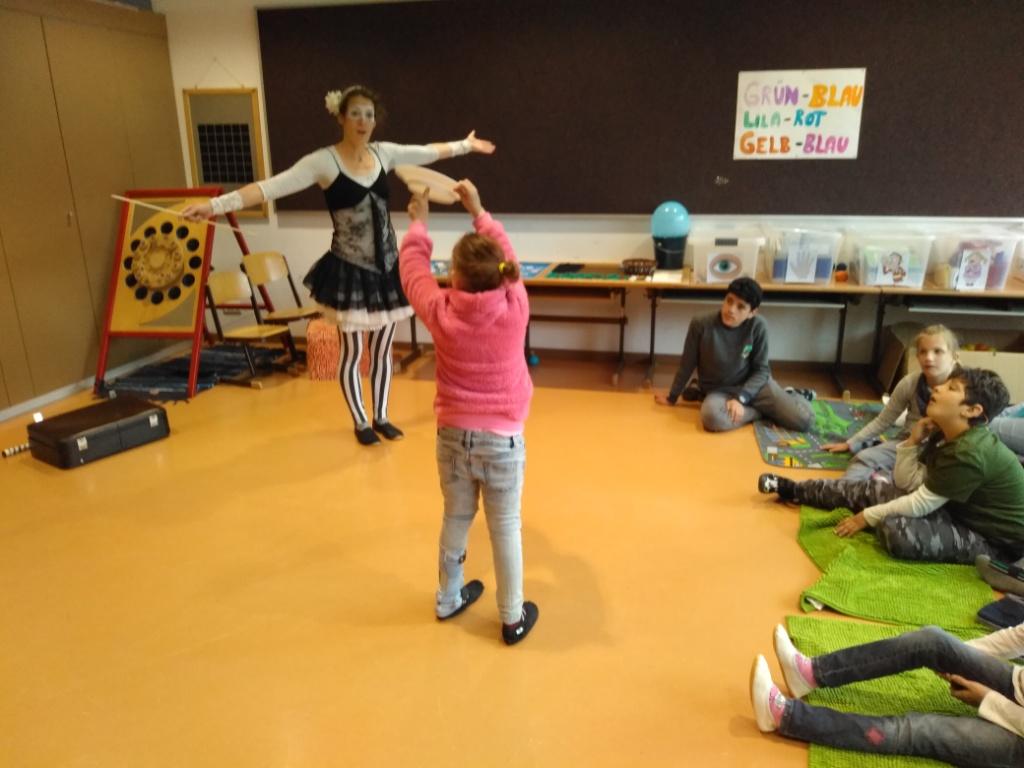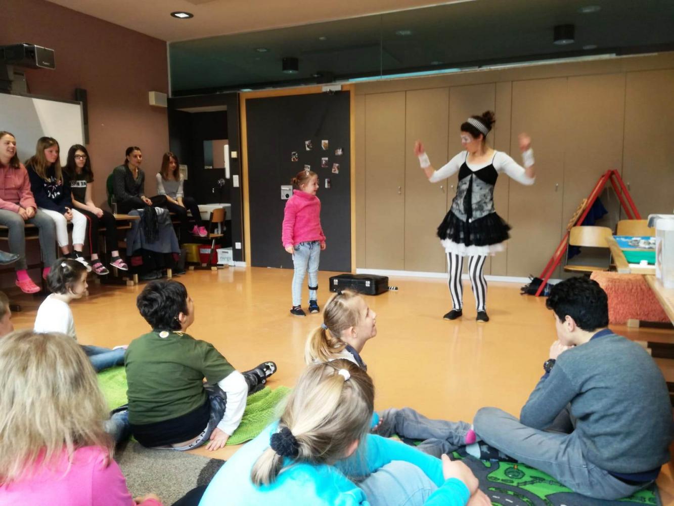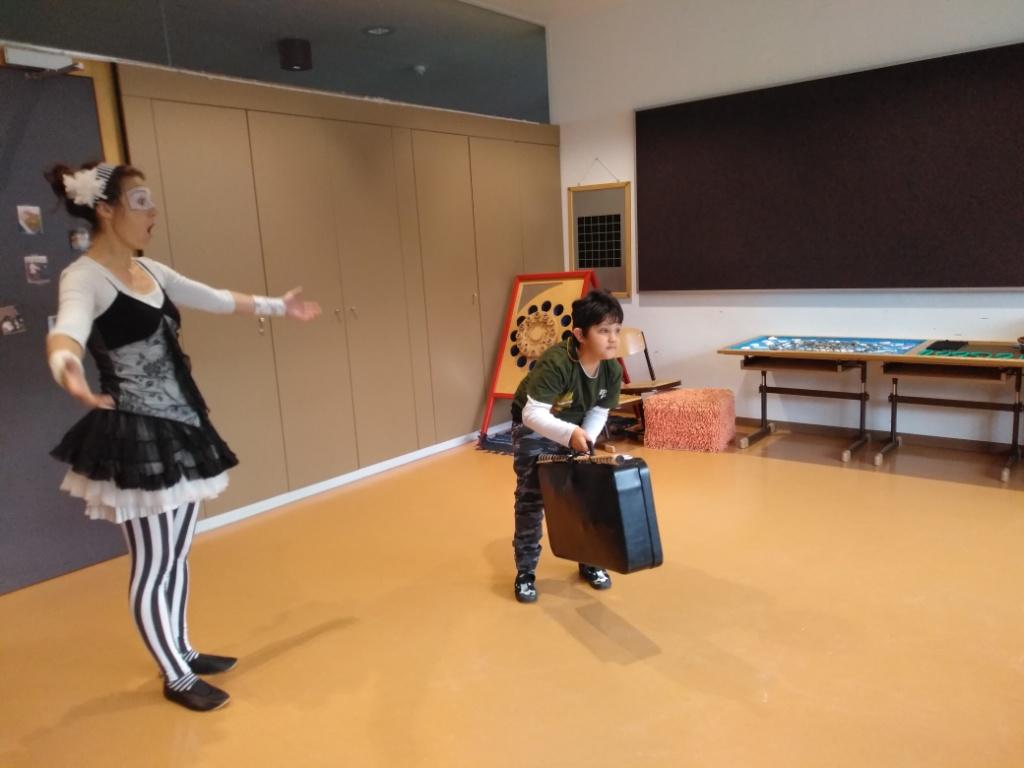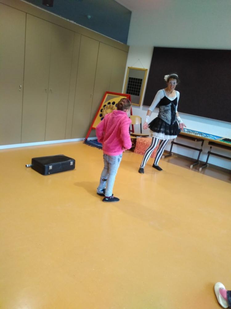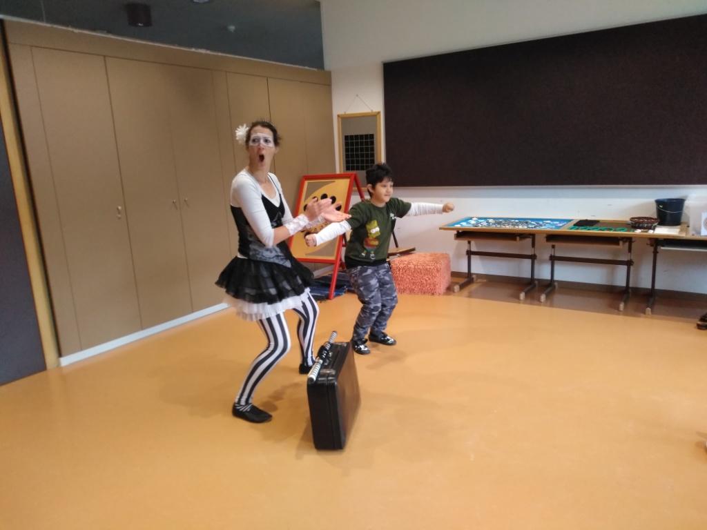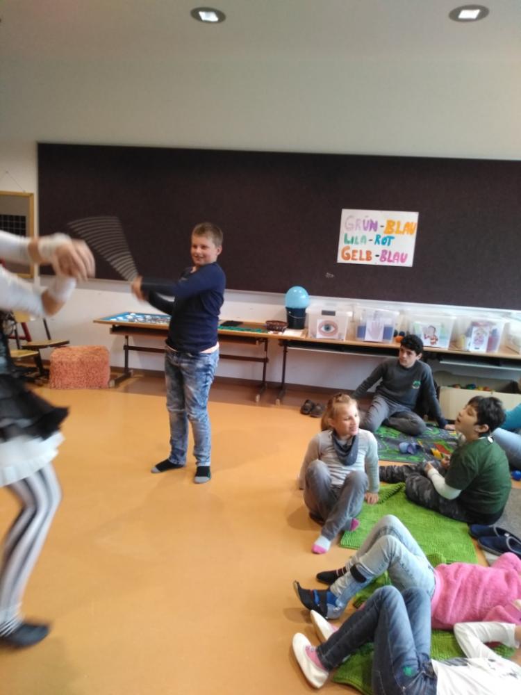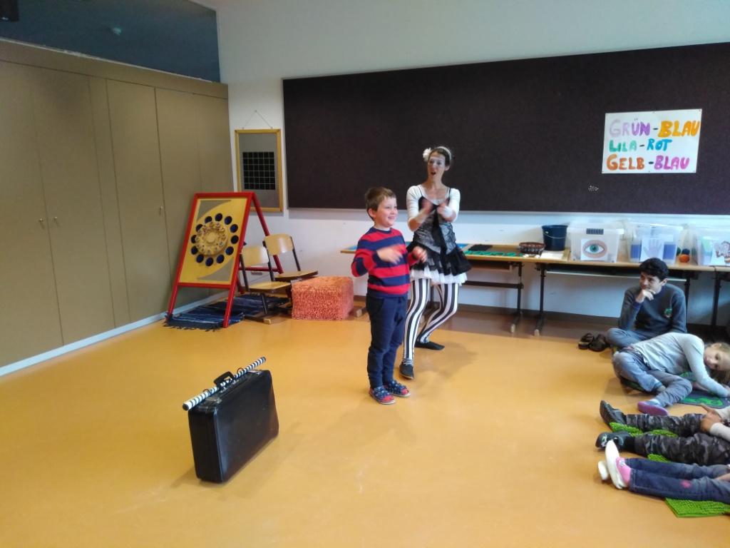 Stand beim letzten Besuch vom Kulturservice das Erzeugen von Geräuschen und Musik im Vordergrund, ging es diesmal mäuschenstill einher. Die Pantomime "Frieda" kam uns mit ihrem "schweren" Koffer besuchen, aus dem sie allerhand Schätze zauberte. Nur mit Gesten und Mimik erzeugte sie eine Welt von Gegenständen und Handlungen, in der die Kinder zu Mitspielern wurden. Von klein bis groß, allen zauberte sie ein Lächeln ins Gesicht und so manches Talent kam zum Vorschein.