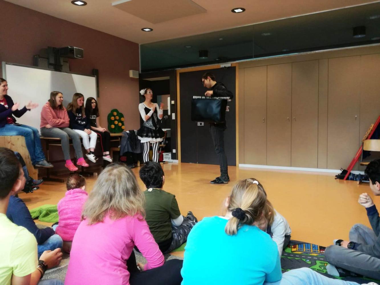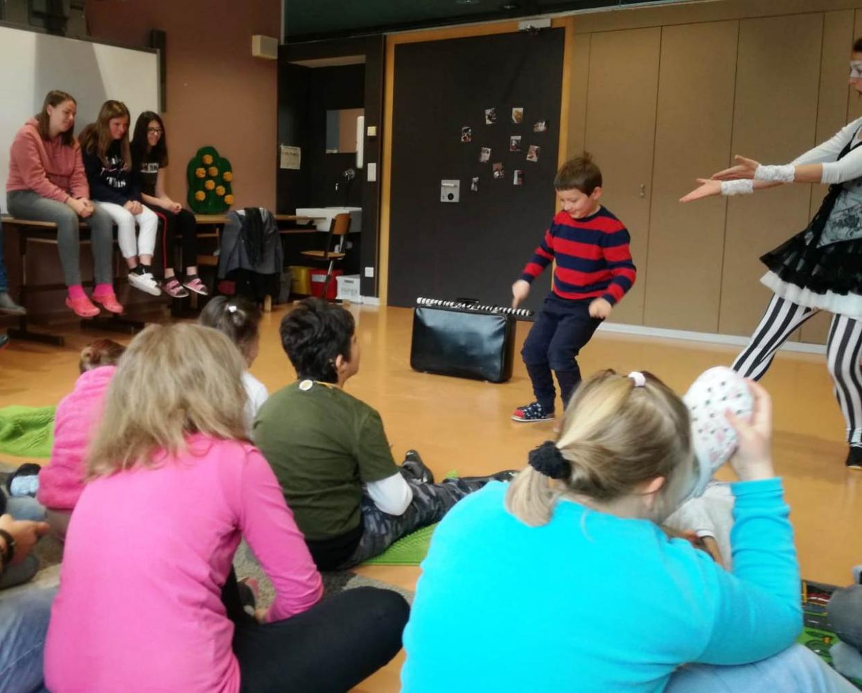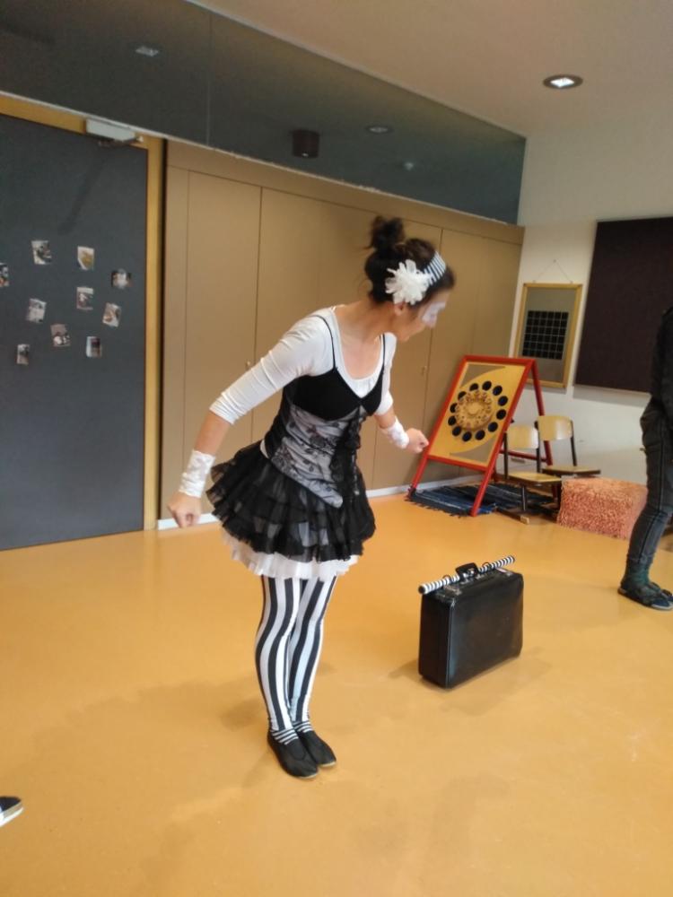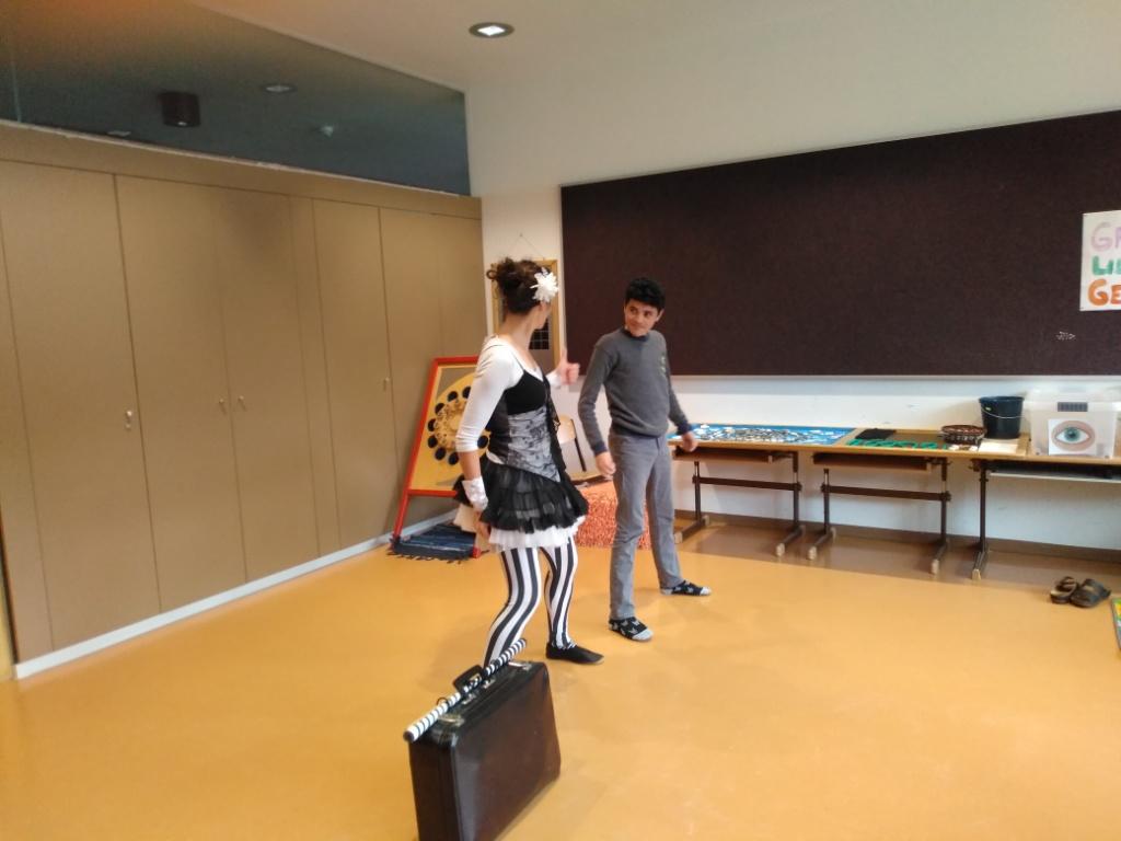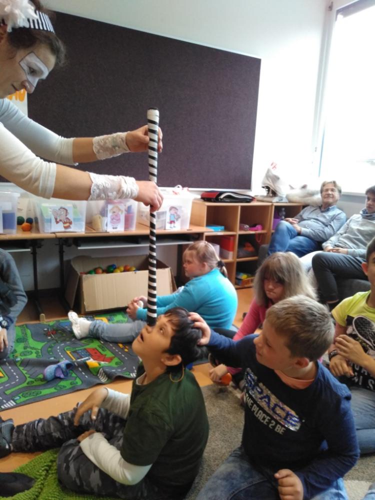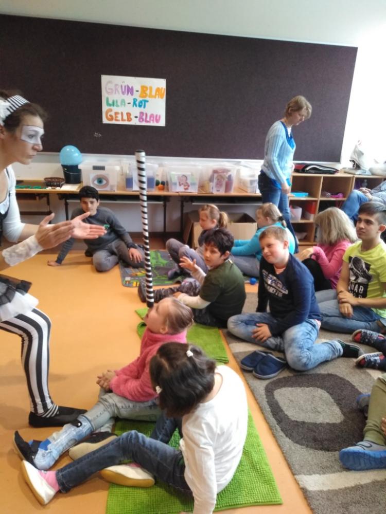 Stand beim letzten Besuch vom Kulturservice das Erzeugen von Geräuschen und Musik im Vordergrund, ging es diesmal mäuschenstill einher. Die Pantomime "Frieda" kam uns mit ihrem "schweren" Koffer besuchen, aus dem sie allerhand Schätze zauberte. Nur mit Gesten und Mimik erzeugte sie eine Welt von Gegenständen und Handlungen, in der die Kinder zu Mitspielern wurden. Von klein bis groß, allen zauberte sie ein Lächeln ins Gesicht und so manches Talent kam zum Vorschein.