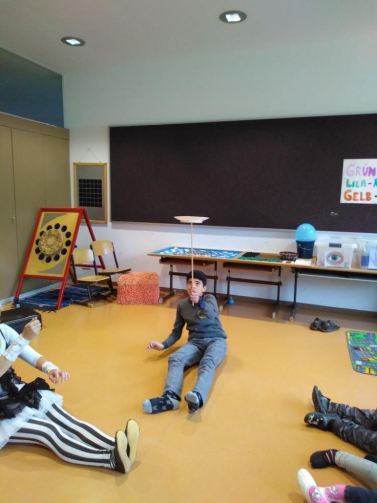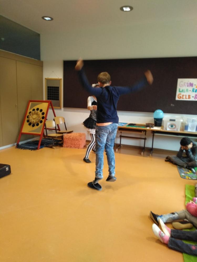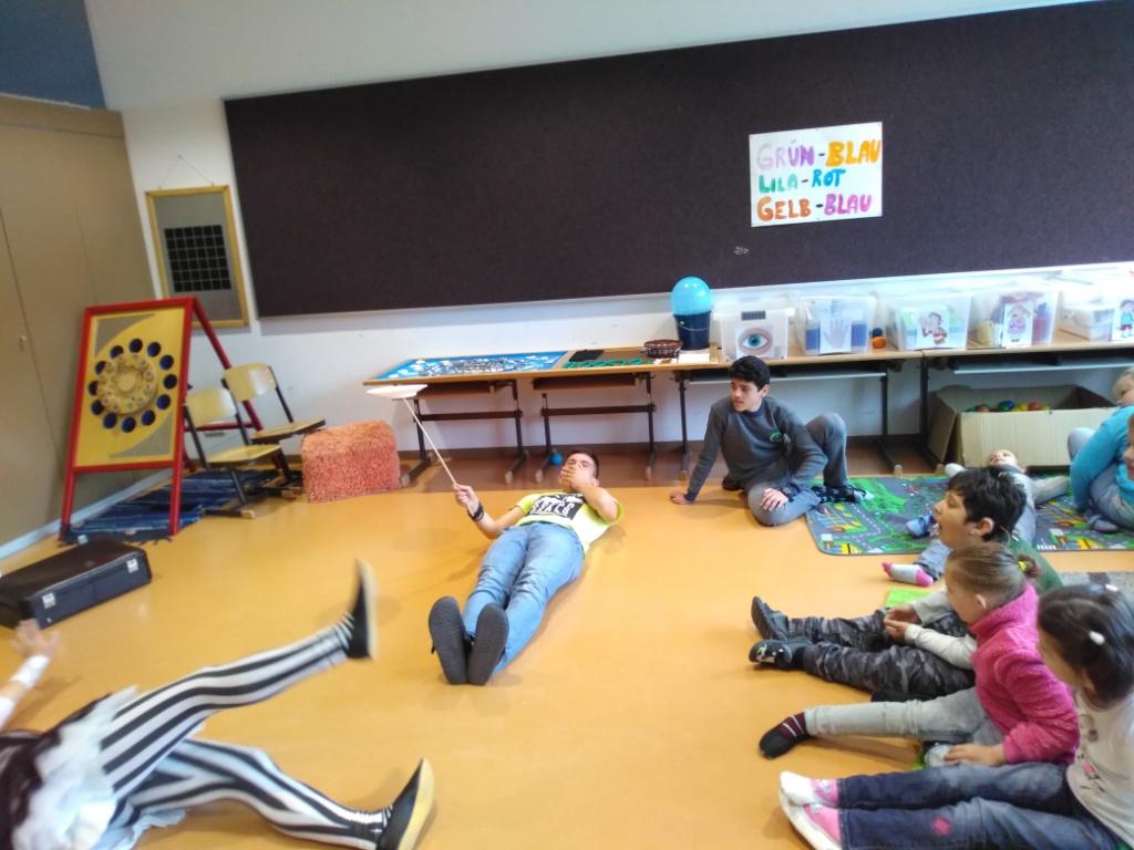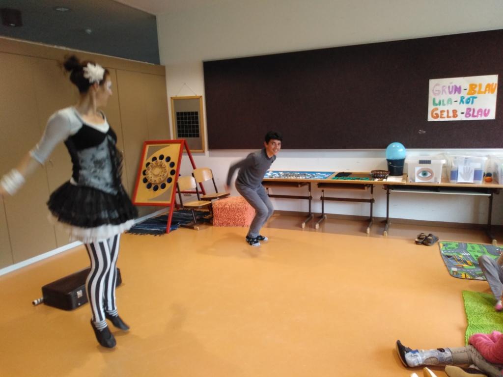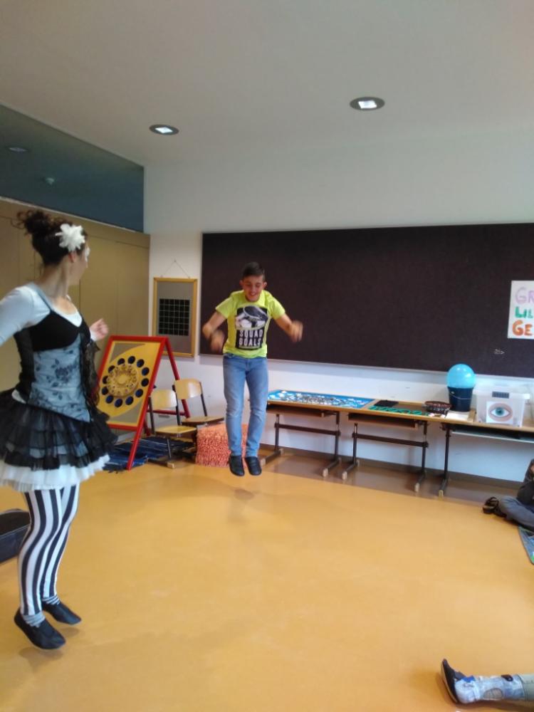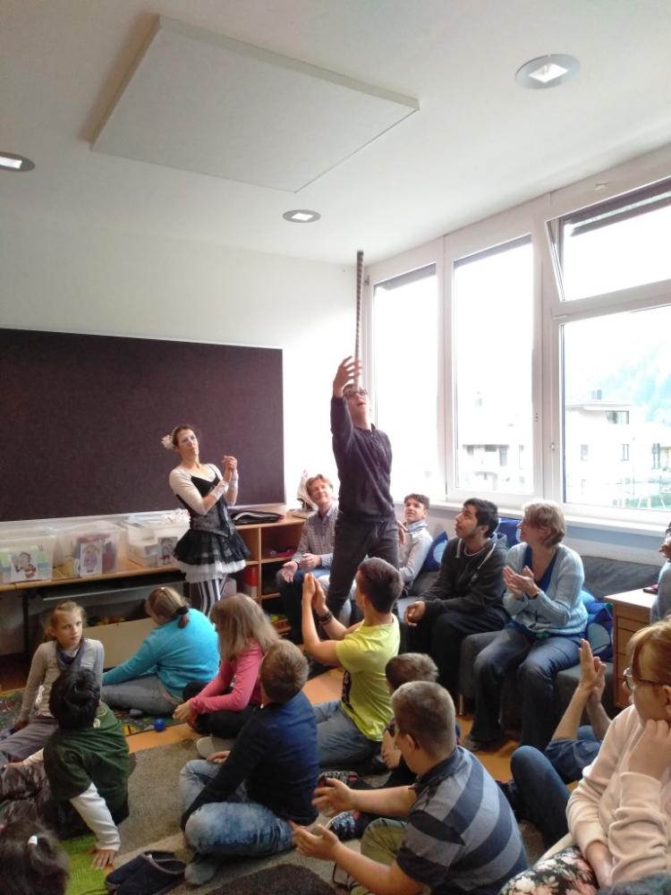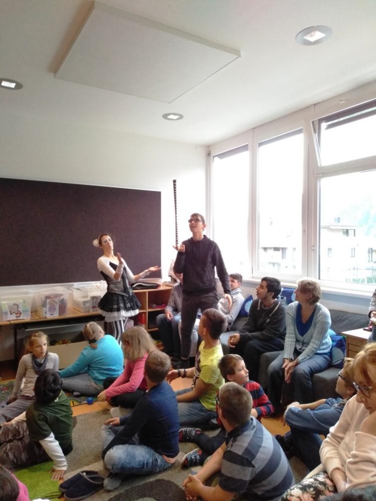 Stand beim letzten Besuch vom Kulturservice das Erzeugen von Geräuschen und Musik im Vordergrund, ging es diesmal mäuschenstill einher. Die Pantomime "Frieda" kam uns mit ihrem "schweren" Koffer besuchen, aus dem sie allerhand Schätze zauberte. Nur mit Gesten und Mimik erzeugte sie eine Welt von Gegenständen und Handlungen, in der die Kinder zu Mitspielern wurden. Von klein bis groß, allen zauberte sie ein Lächeln ins Gesicht und so manches Talent kam zum Vorschein.