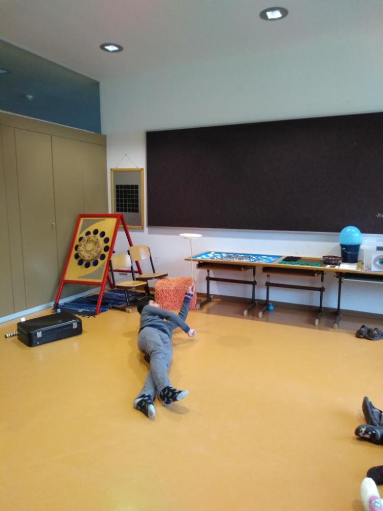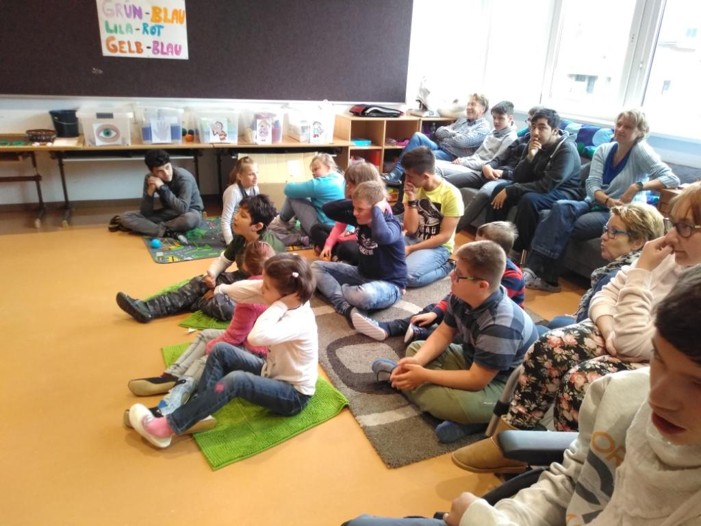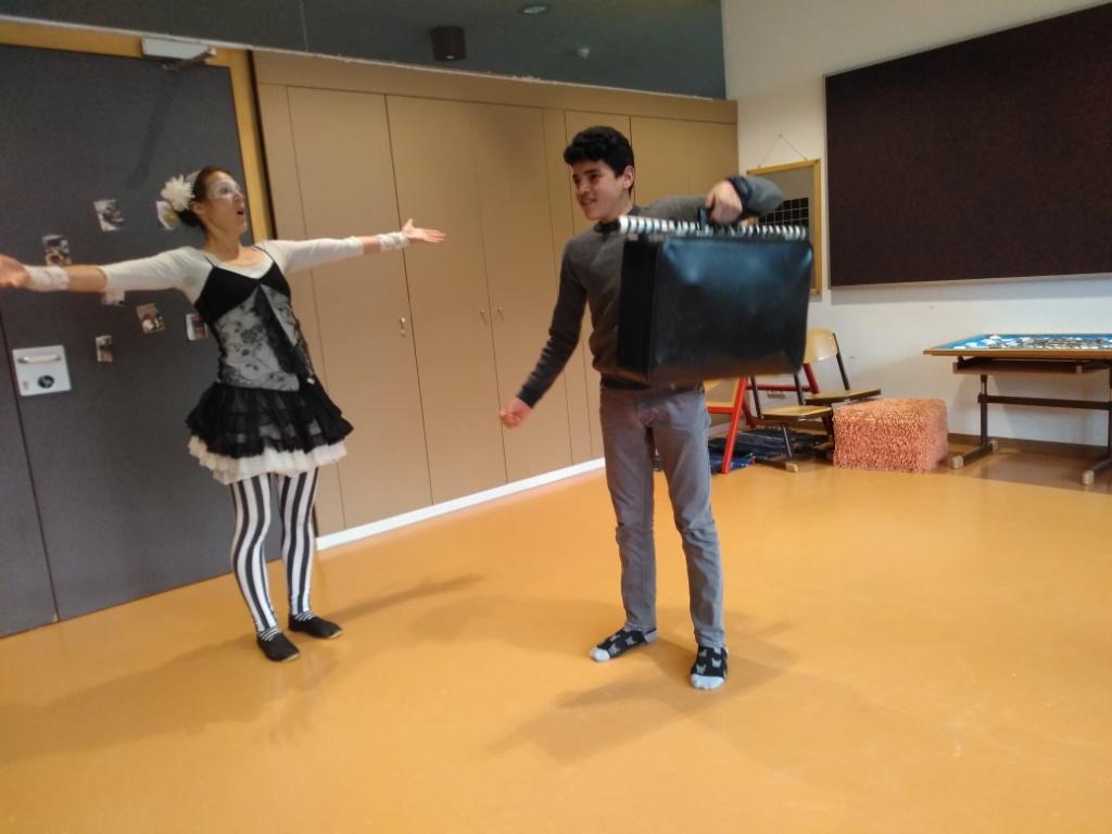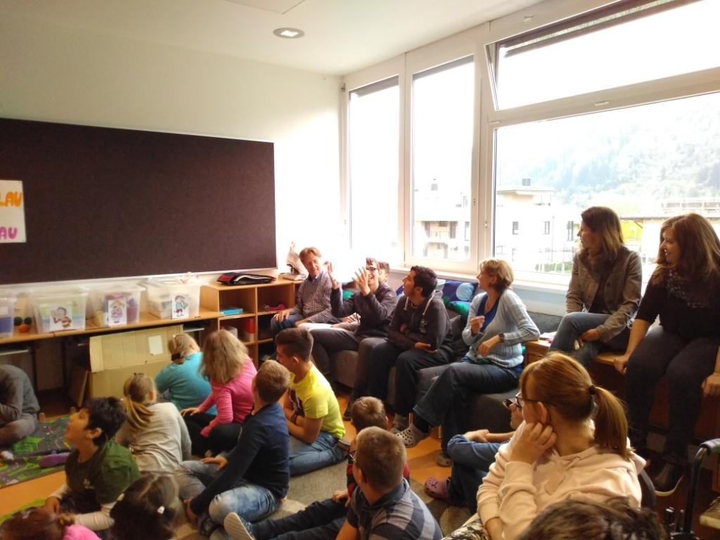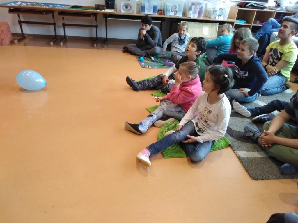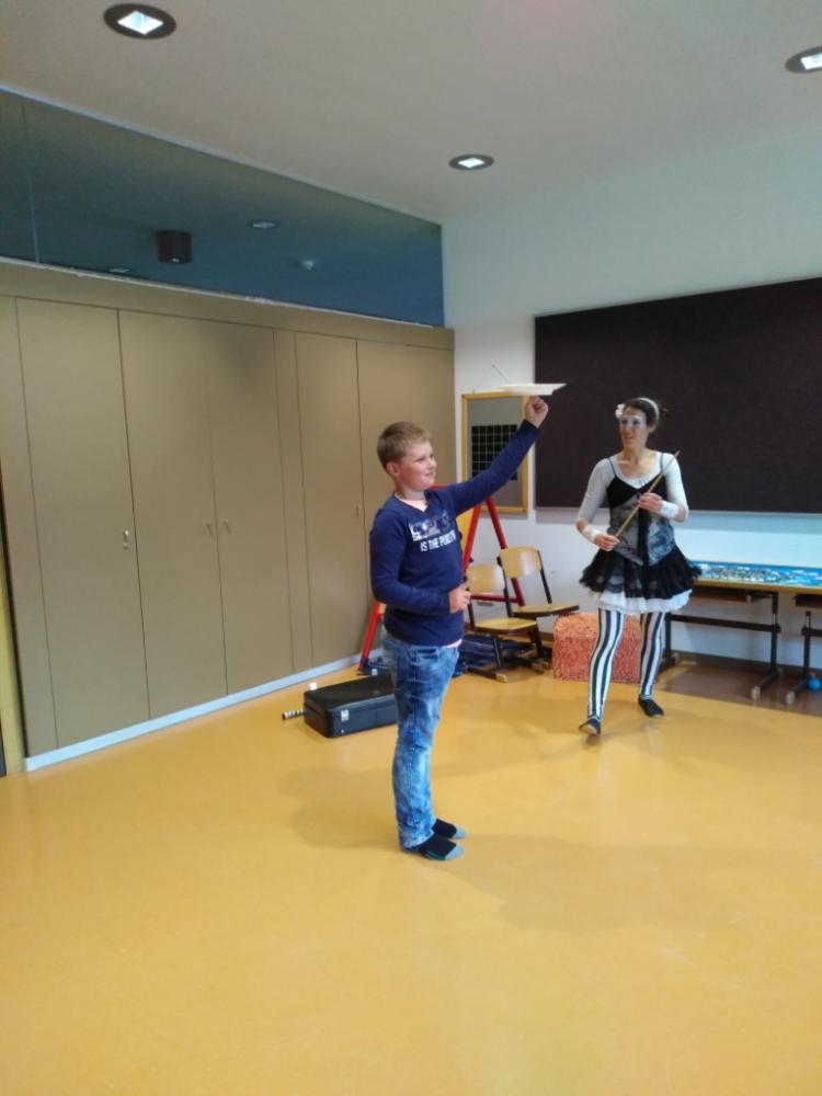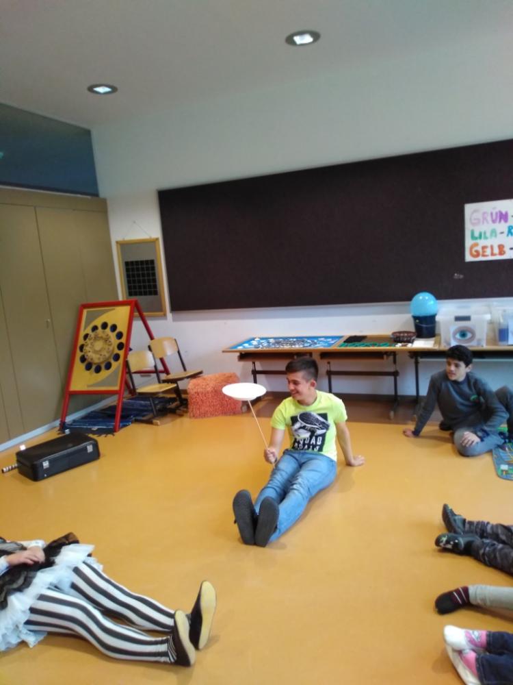 Stand beim letzten Besuch vom Kulturservice das Erzeugen von Geräuschen und Musik im Vordergrund, ging es diesmal mäuschenstill einher. Die Pantomime "Frieda" kam uns mit ihrem "schweren" Koffer besuchen, aus dem sie allerhand Schätze zauberte. Nur mit Gesten und Mimik erzeugte sie eine Welt von Gegenständen und Handlungen, in der die Kinder zu Mitspielern wurden. Von klein bis groß, allen zauberte sie ein Lächeln ins Gesicht und so manches Talent kam zum Vorschein.