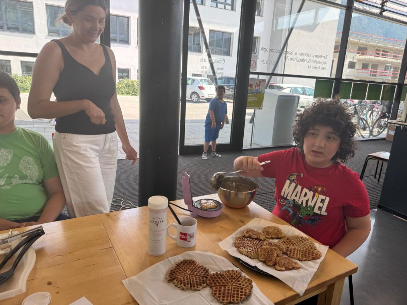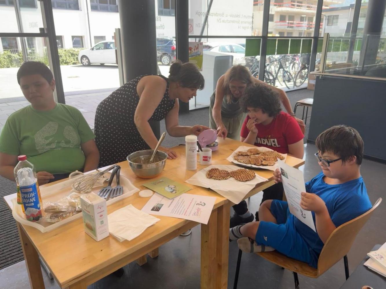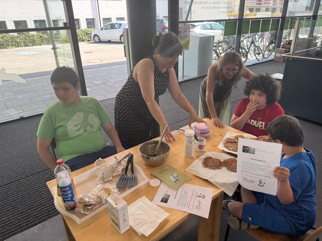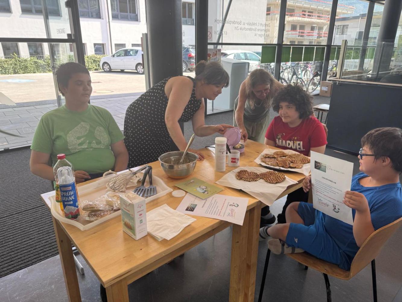Tiroler Geschichtensommer von Johanna Weithaler 26. Juni 2025 2ASO Schuljahr 2024/25 Bibliothek Gemeinsam mit Lou, unserer Bibliothekarin, backen wir Bananenwaffeln, lernen einen Jausenspruch mit Gebärden kennen und lassen uns die Waffeln natürlich auch schmecken. Toll wars!