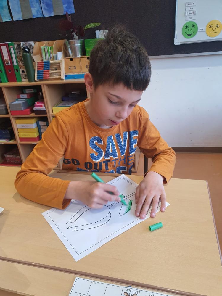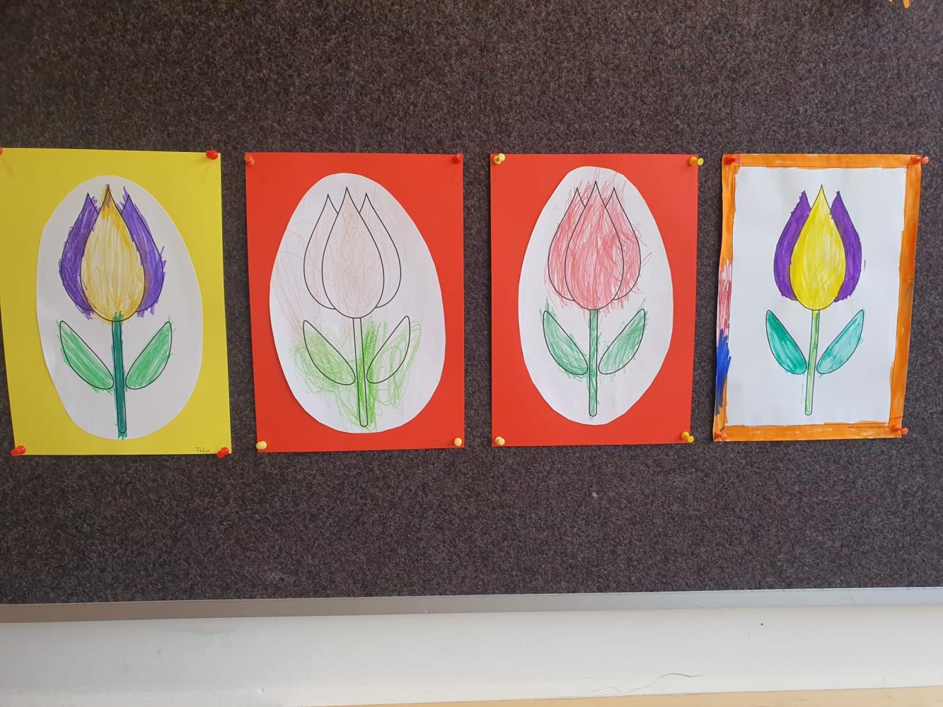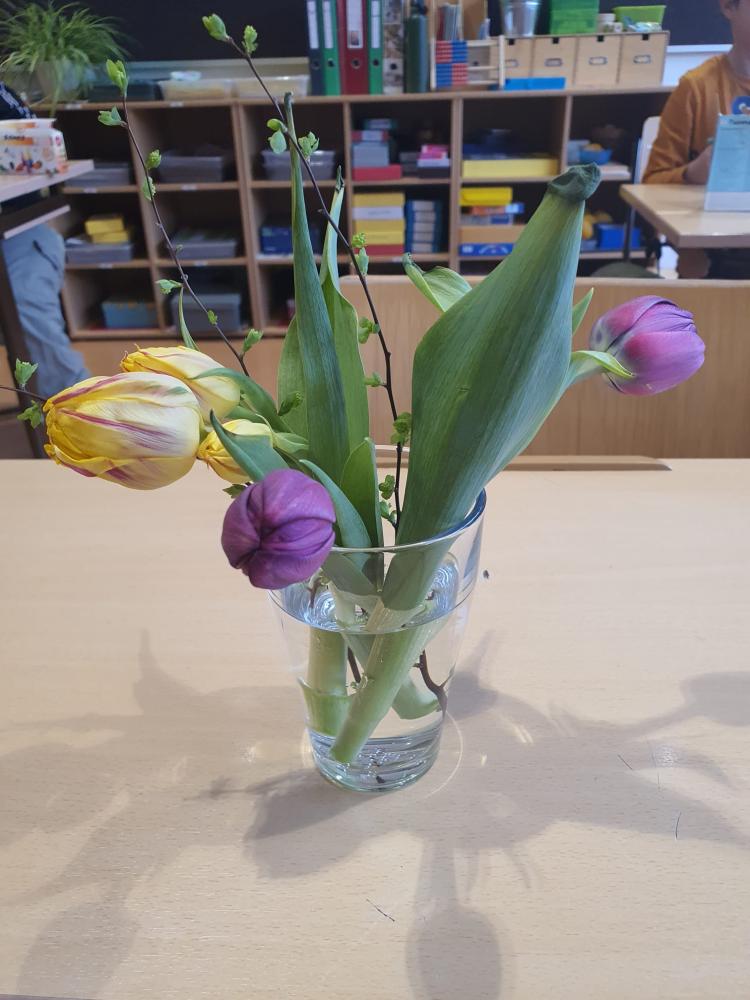 Tulpen im Frühling von Johanna Weithaler 29. März 2023 Schuljahr 2022/23 E3 2023/2024 Wir haben die Gelegenheit gleich genutzt und die Teile der Tulpe besprochen und noch eine angemalt.