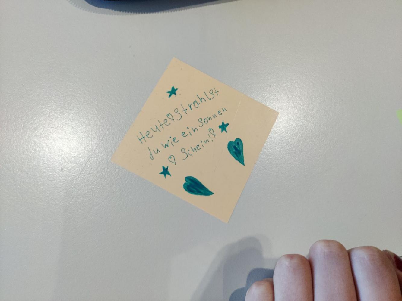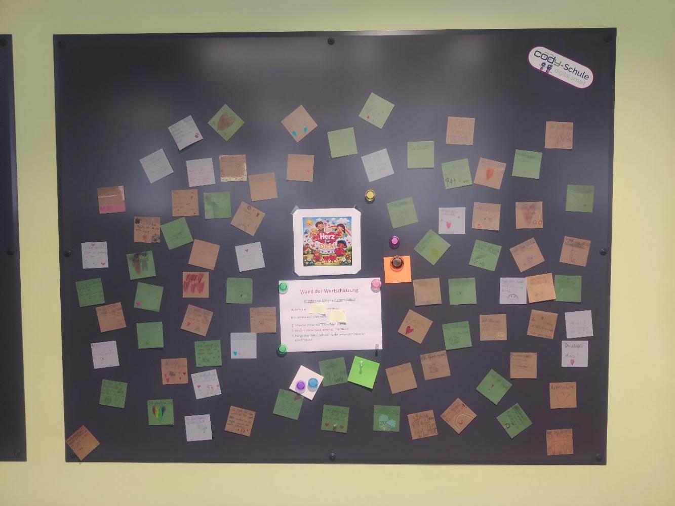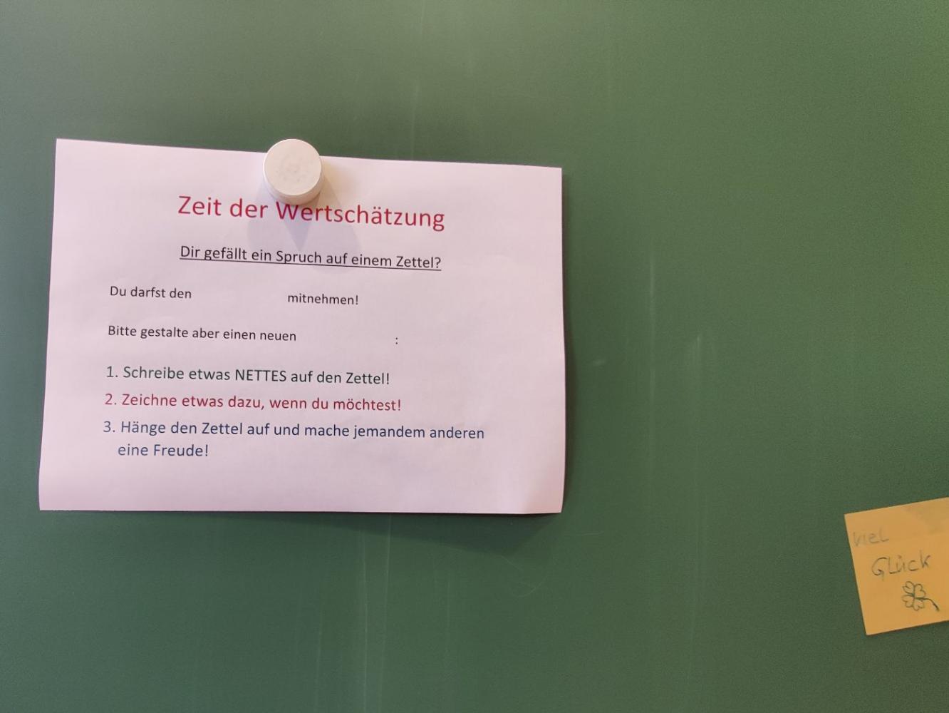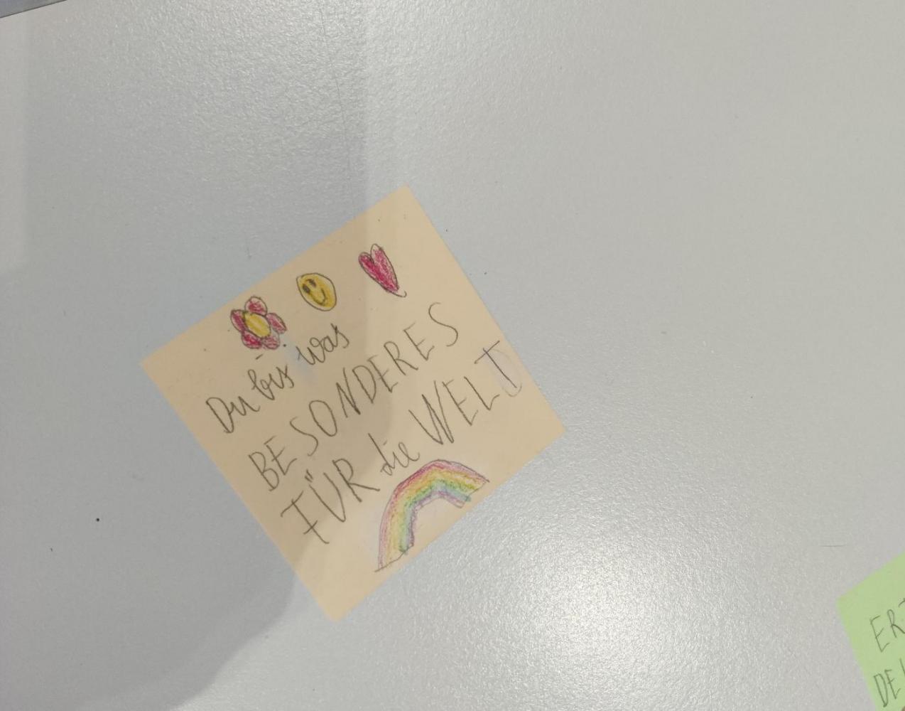 Gemeinsam beschrifteten die ASO3 und die 4d kleine Kärtchen mit motivierenden und wertschätzenden Botschaften, die wir auf einer Wand zentral beim Eingang befestigt haben. Jeder ist eingeladen, sich eine Botschaft als kleine positive Verstärkung zu nehmen, soll aber dafür selbst eine neue Botschaft an der Wand anbringen.