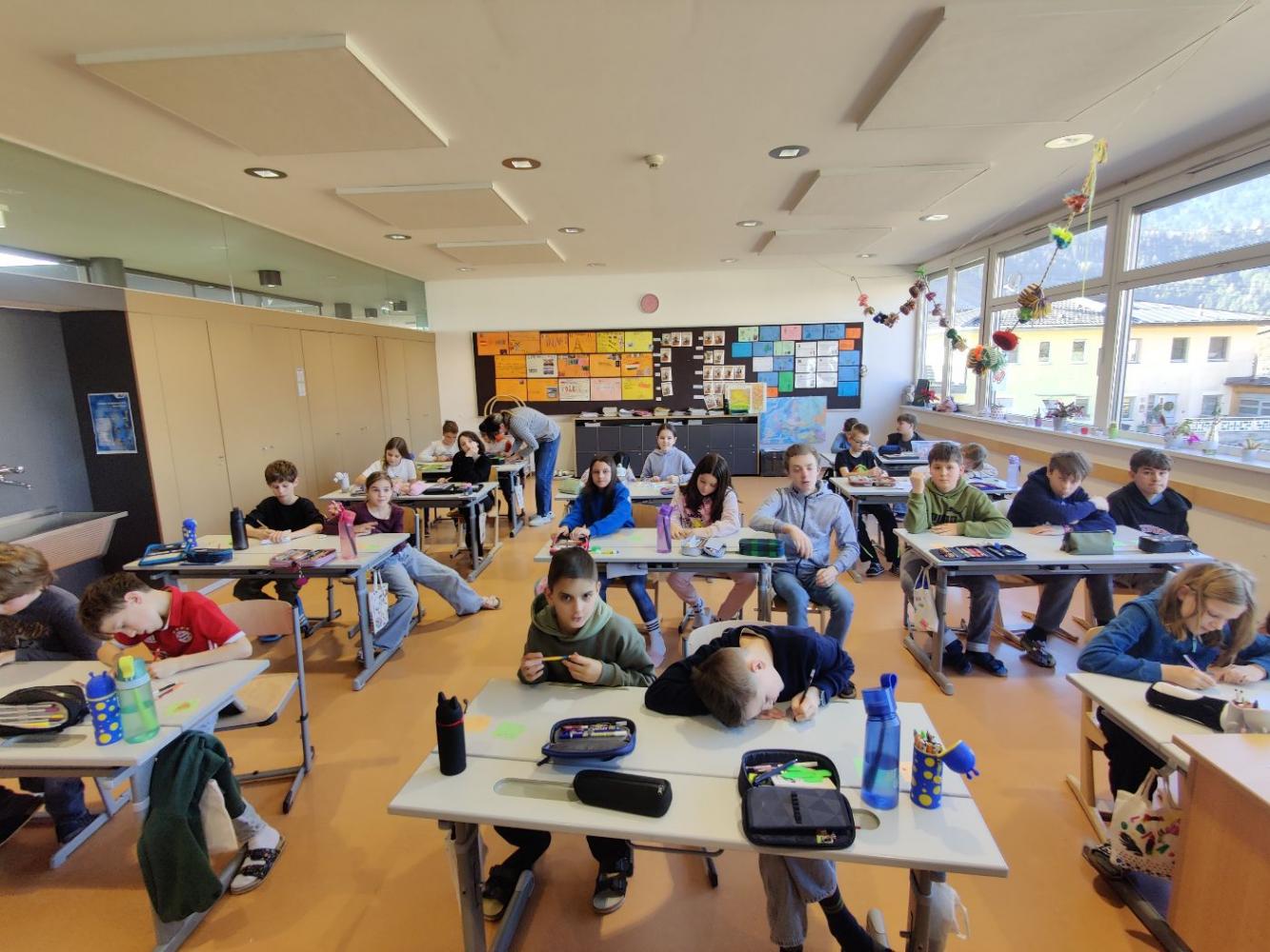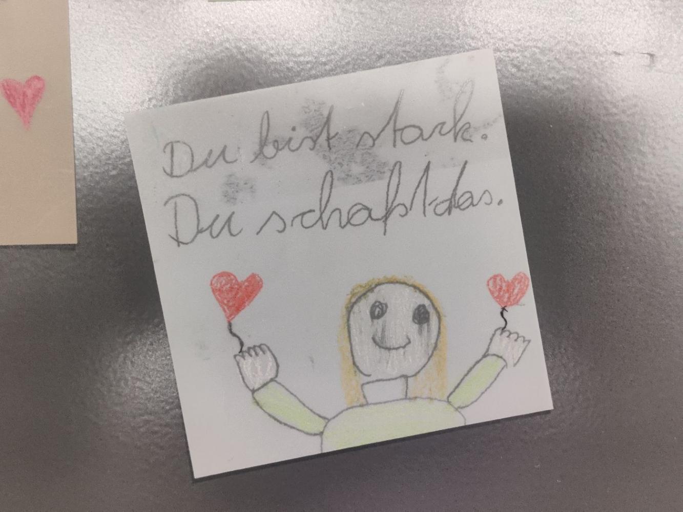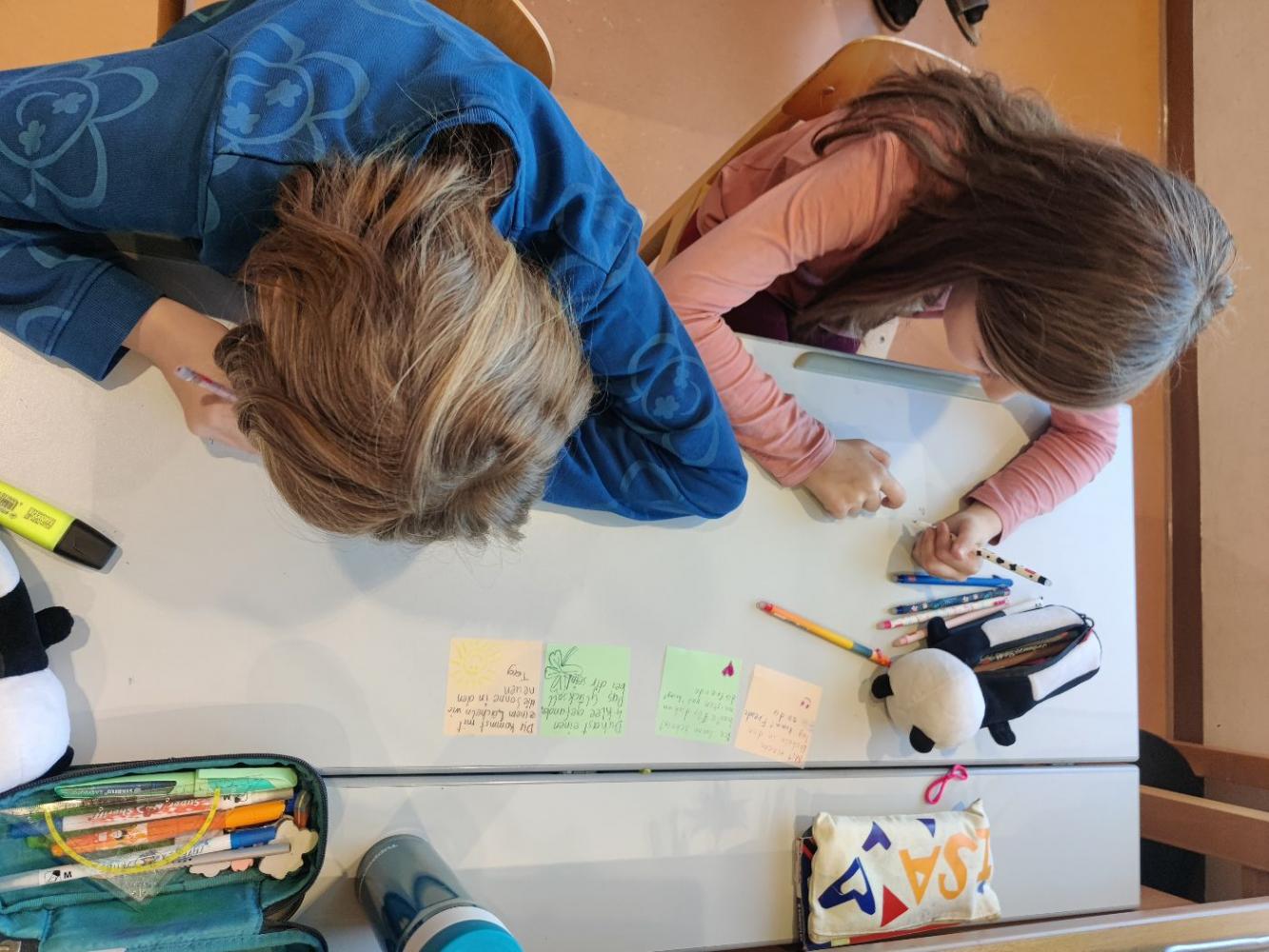 Gemeinsam beschrifteten die ASO3 und die 4d kleine Kärtchen mit motivierenden und wertschätzenden Botschaften, die wir auf einer Wand zentral beim Eingang befestigt haben. Jeder ist eingeladen, sich eine Botschaft als kleine positive Verstärkung zu nehmen, soll aber dafür selbst eine neue Botschaft an der Wand anbringen.